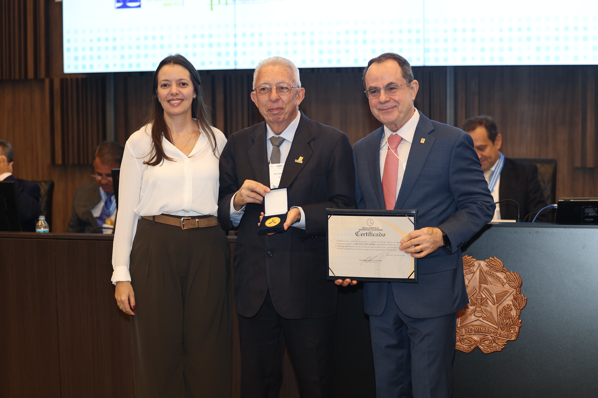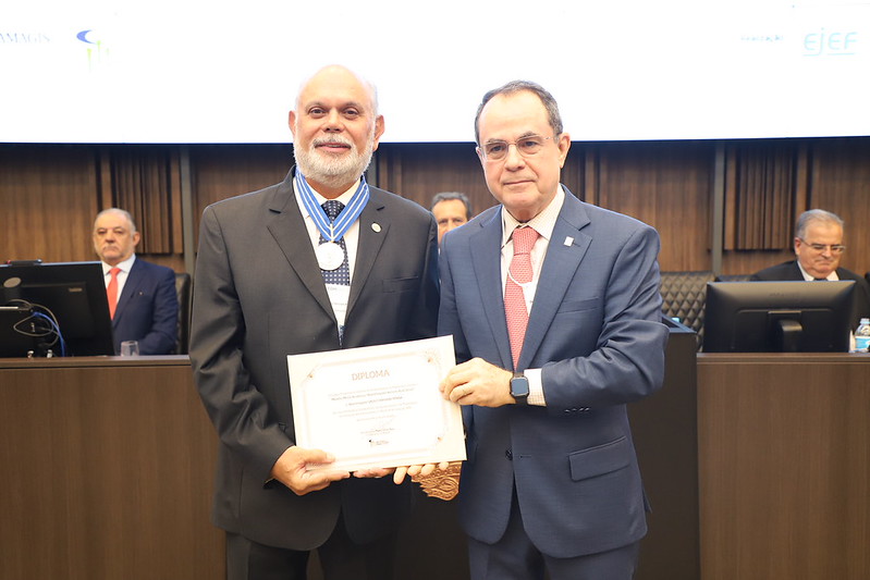 O Medalhão Esmat foi entregue ao desembargador Caetano Levi Lopes e ao juiz-auxiliar da 2° Vice-Presidência do TJMG, Thiago Gandra.